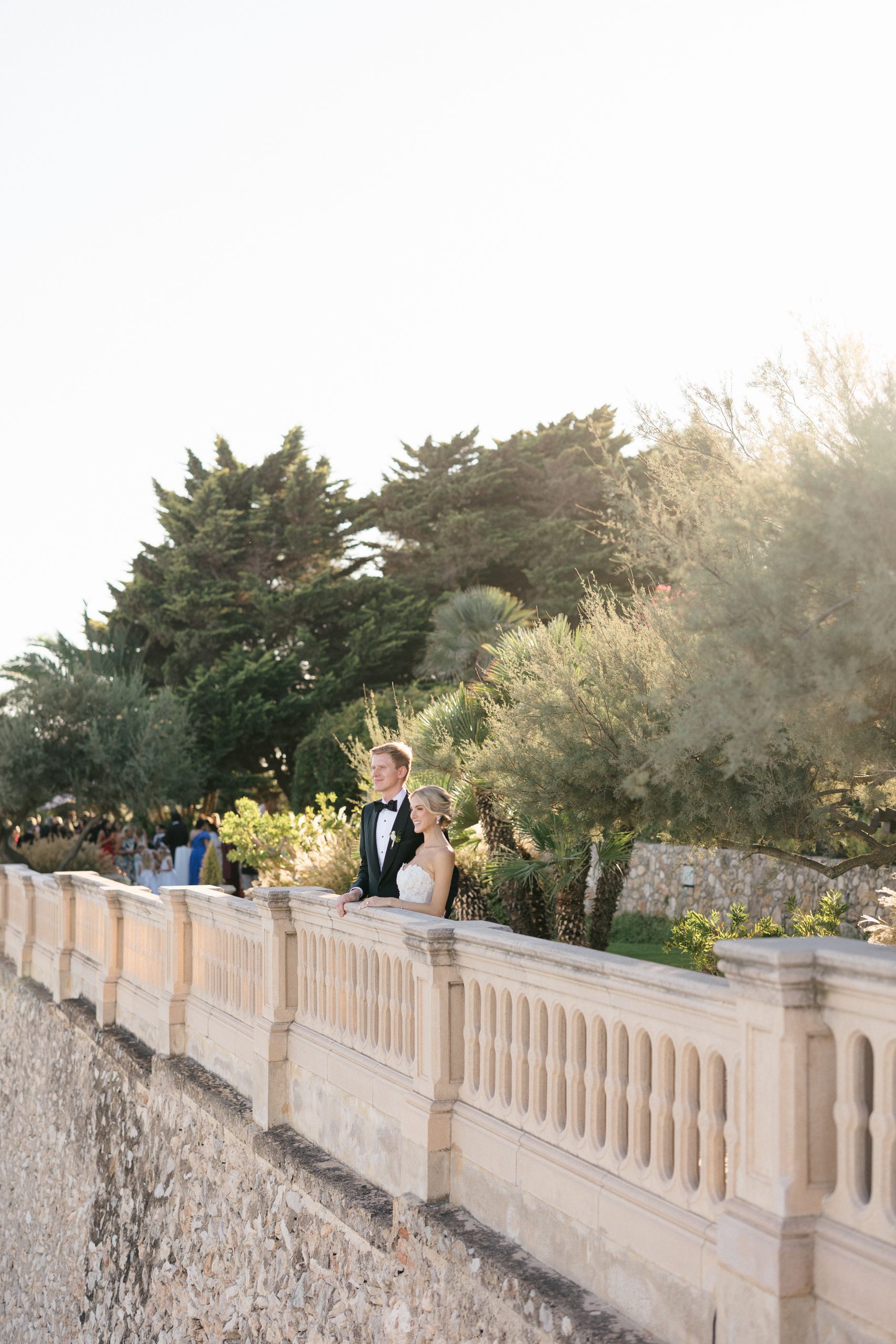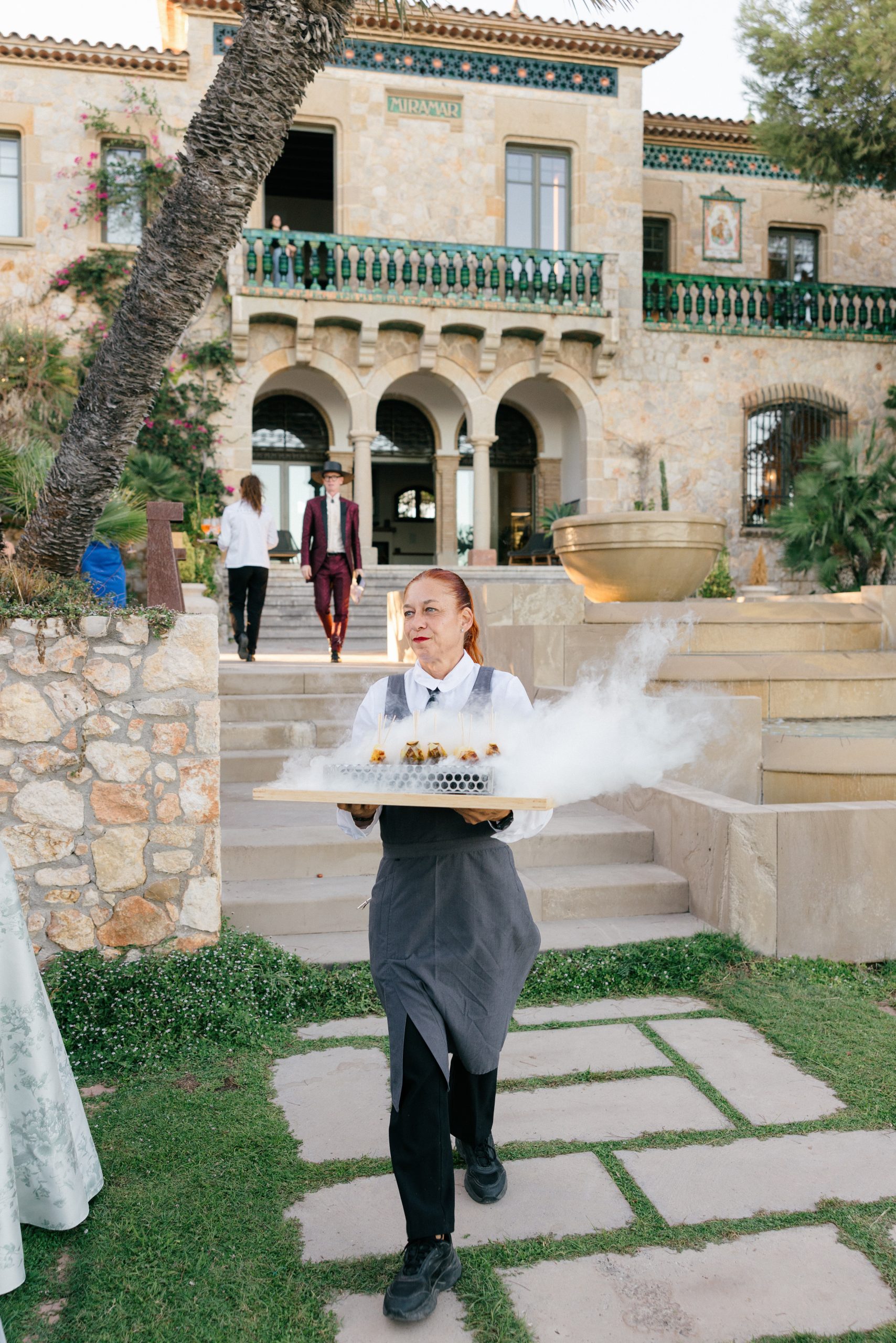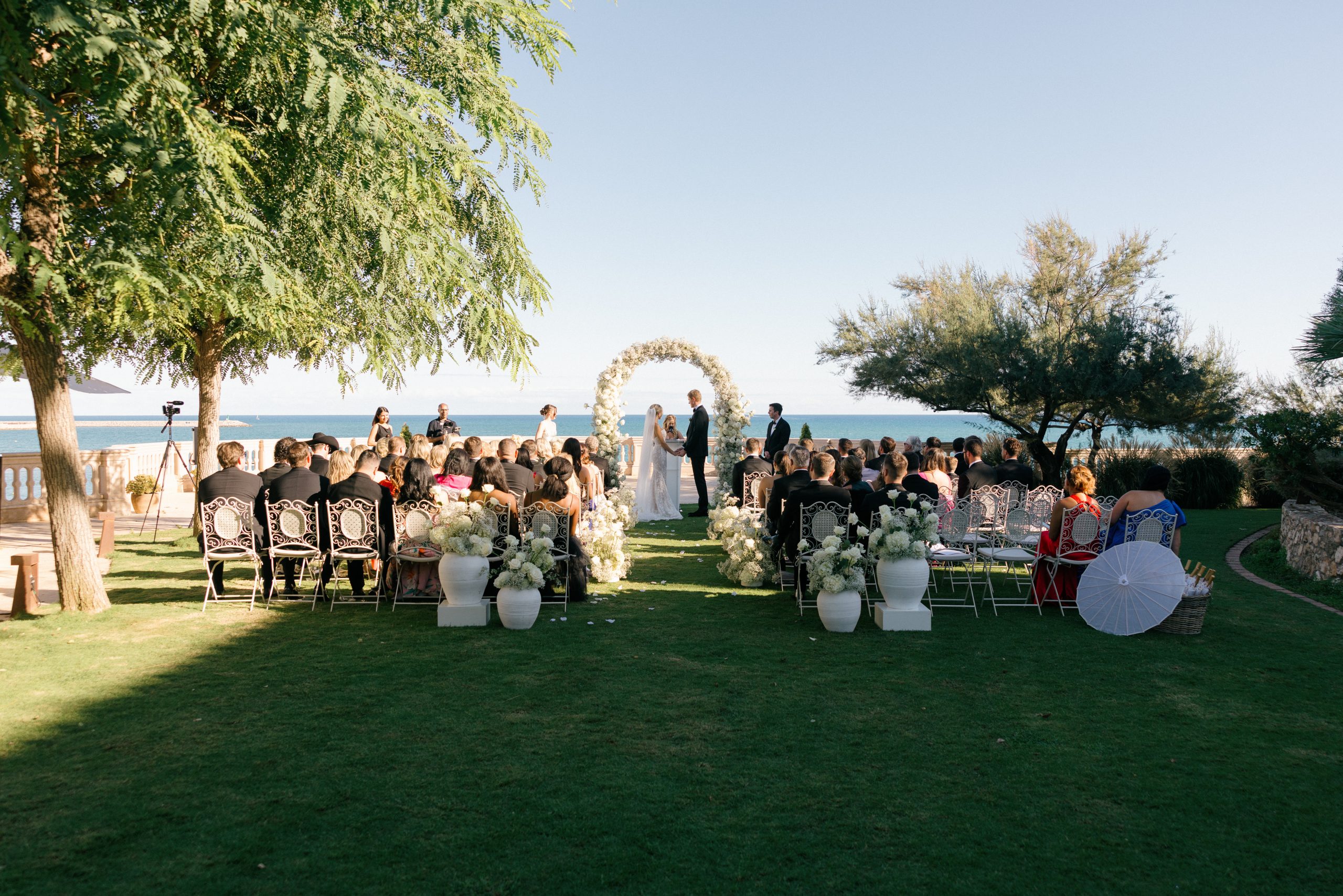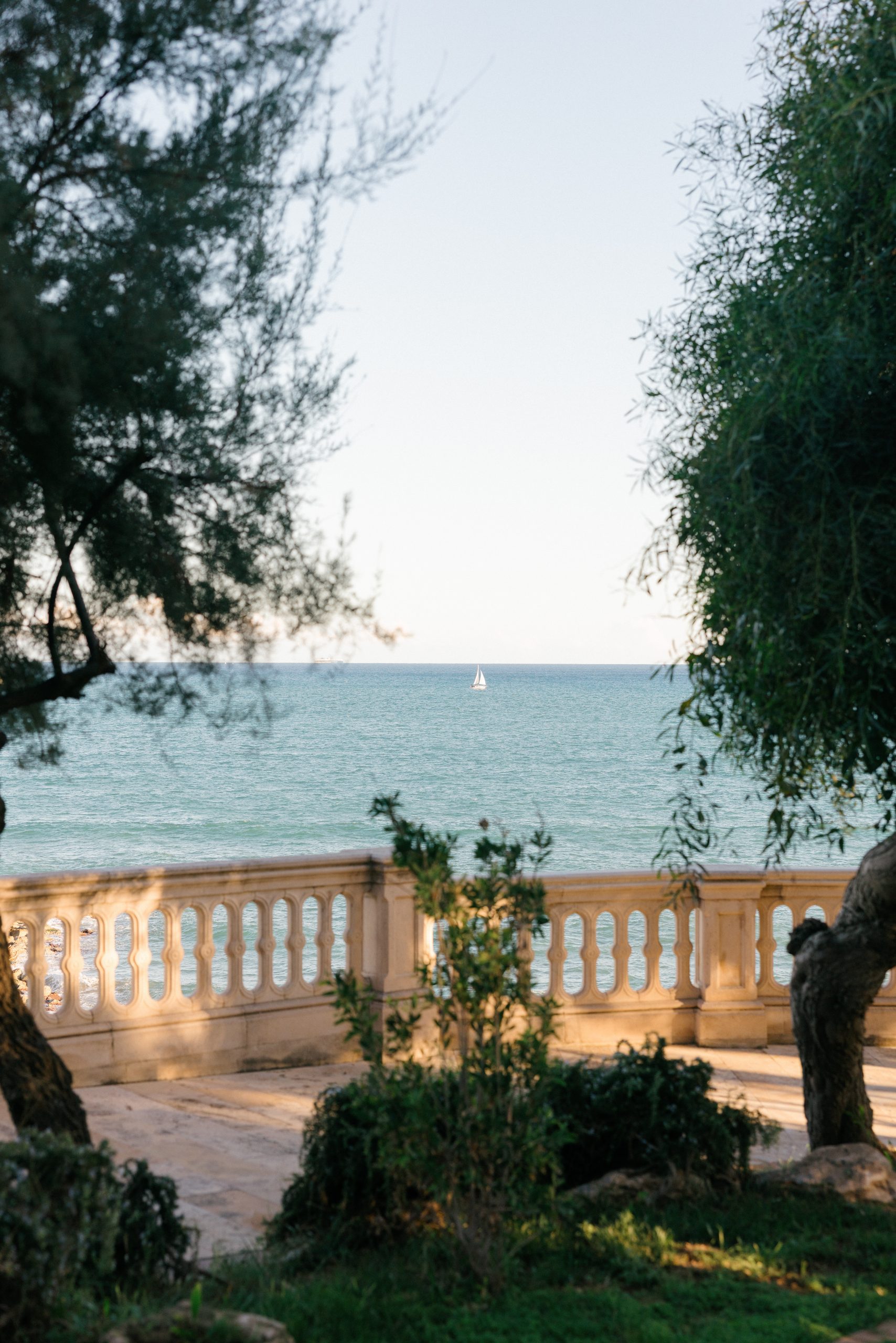 The ceremony took place in the gardens, framed by the blue horizon and the golden afternoon light. Outdoor ceremonies here have a quality that is very hard to replicate anywhere else in Catalonia, the sea, the light and the architecture all working together without any effort.