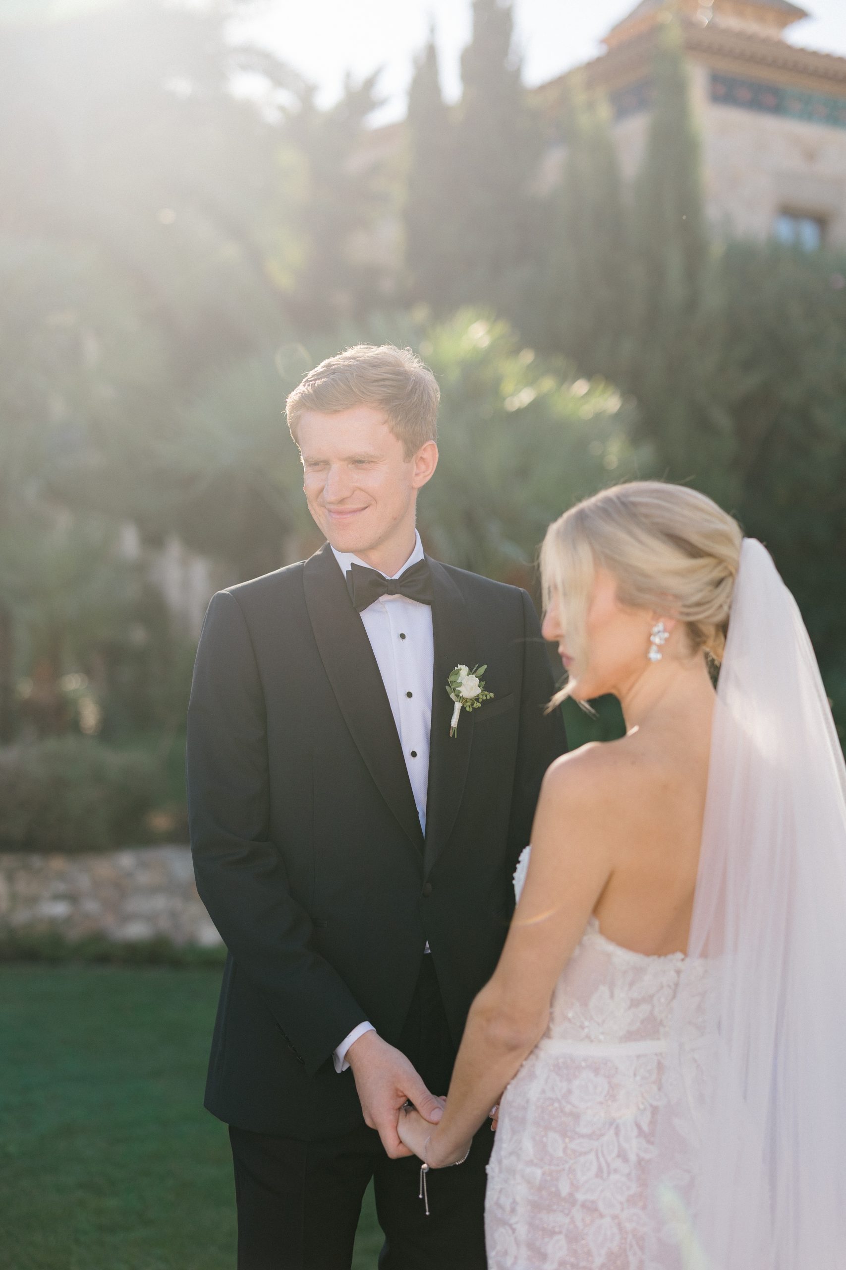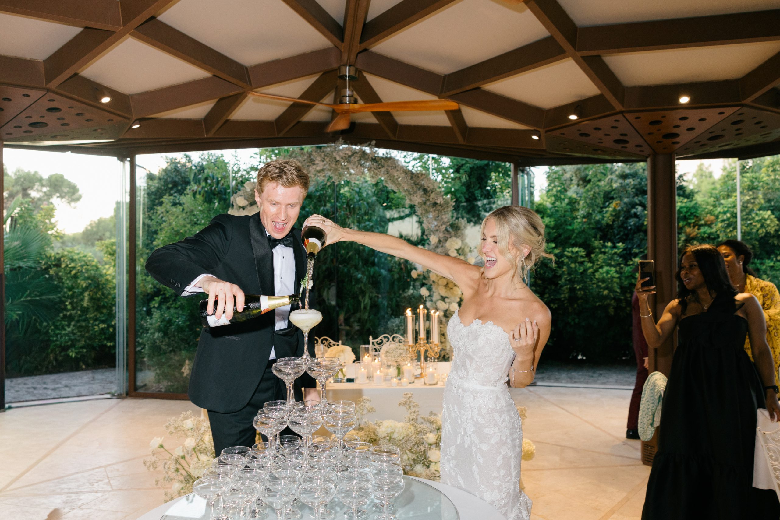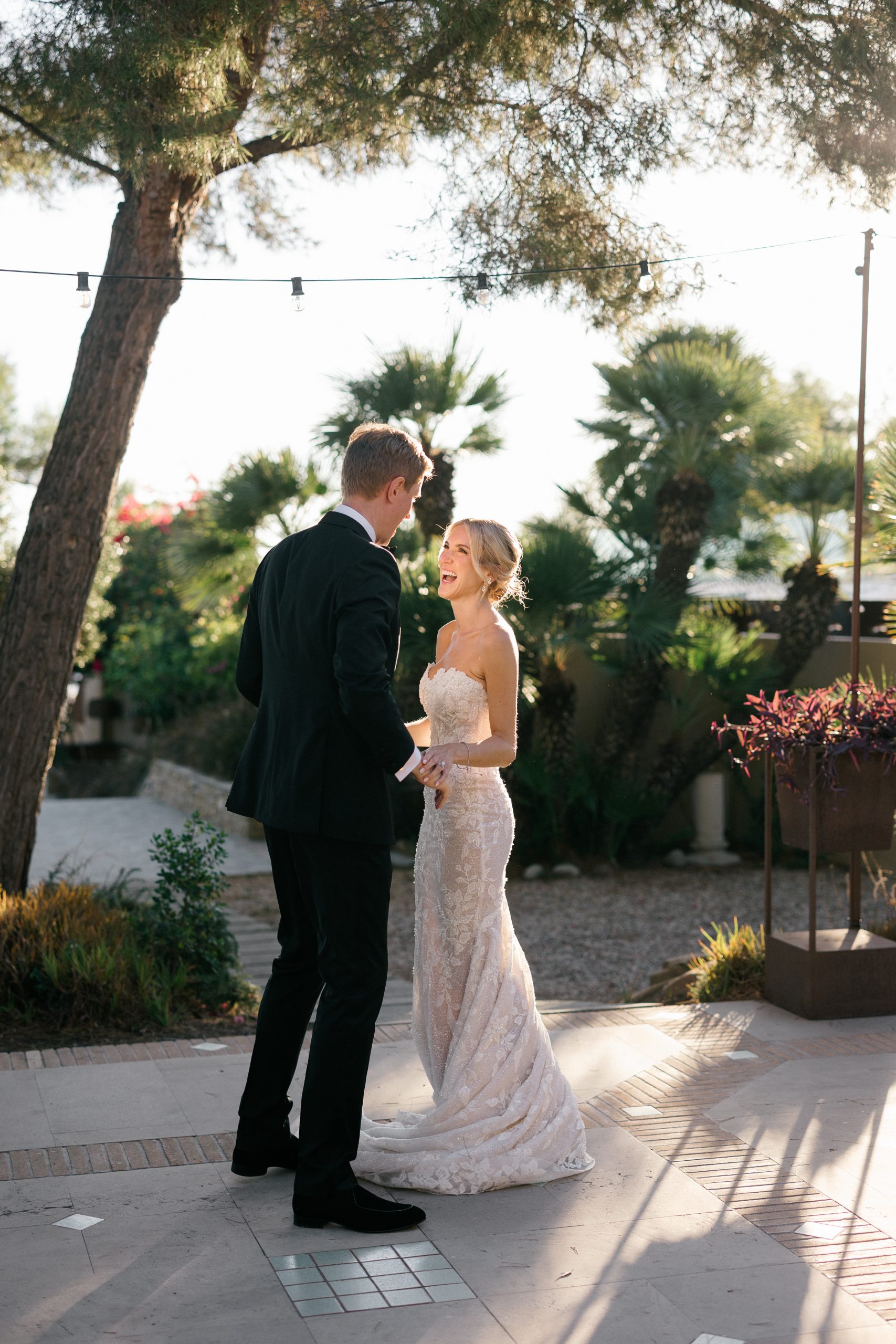 The ceremony took place in the gardens, framed by the blue horizon and the golden afternoon light. Outdoor ceremonies here have a quality that is very hard to replicate anywhere else in Catalonia, the sea, the light and the architecture all working together without any effort.