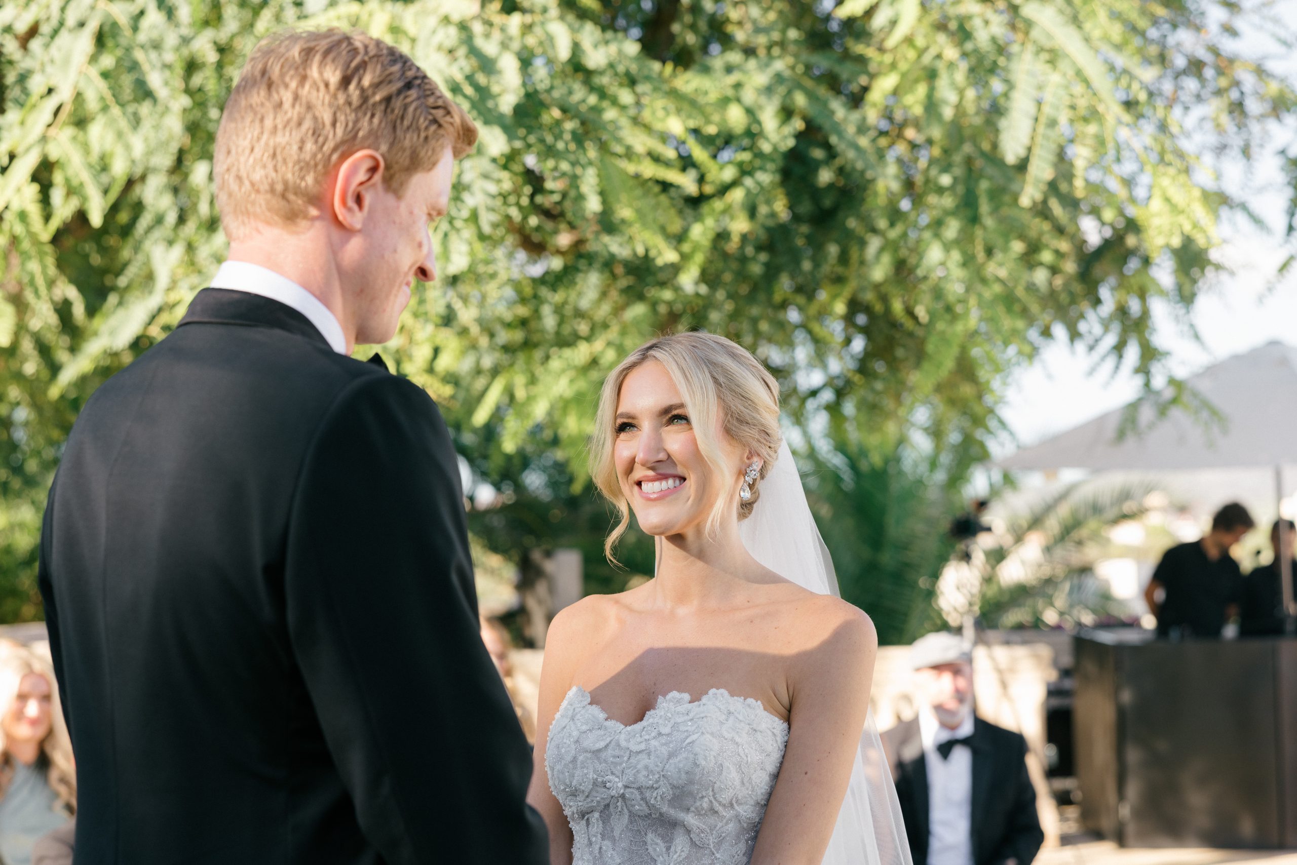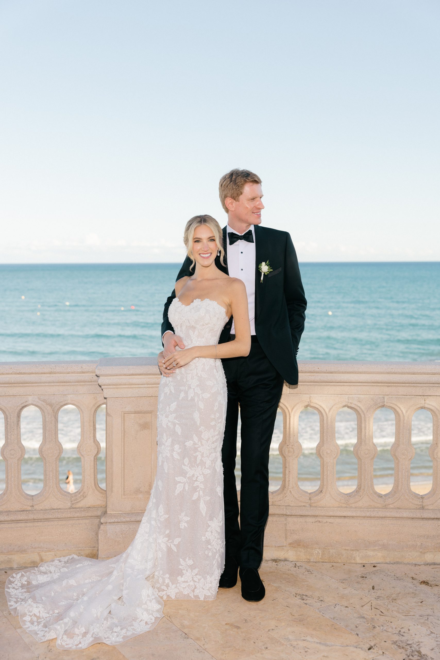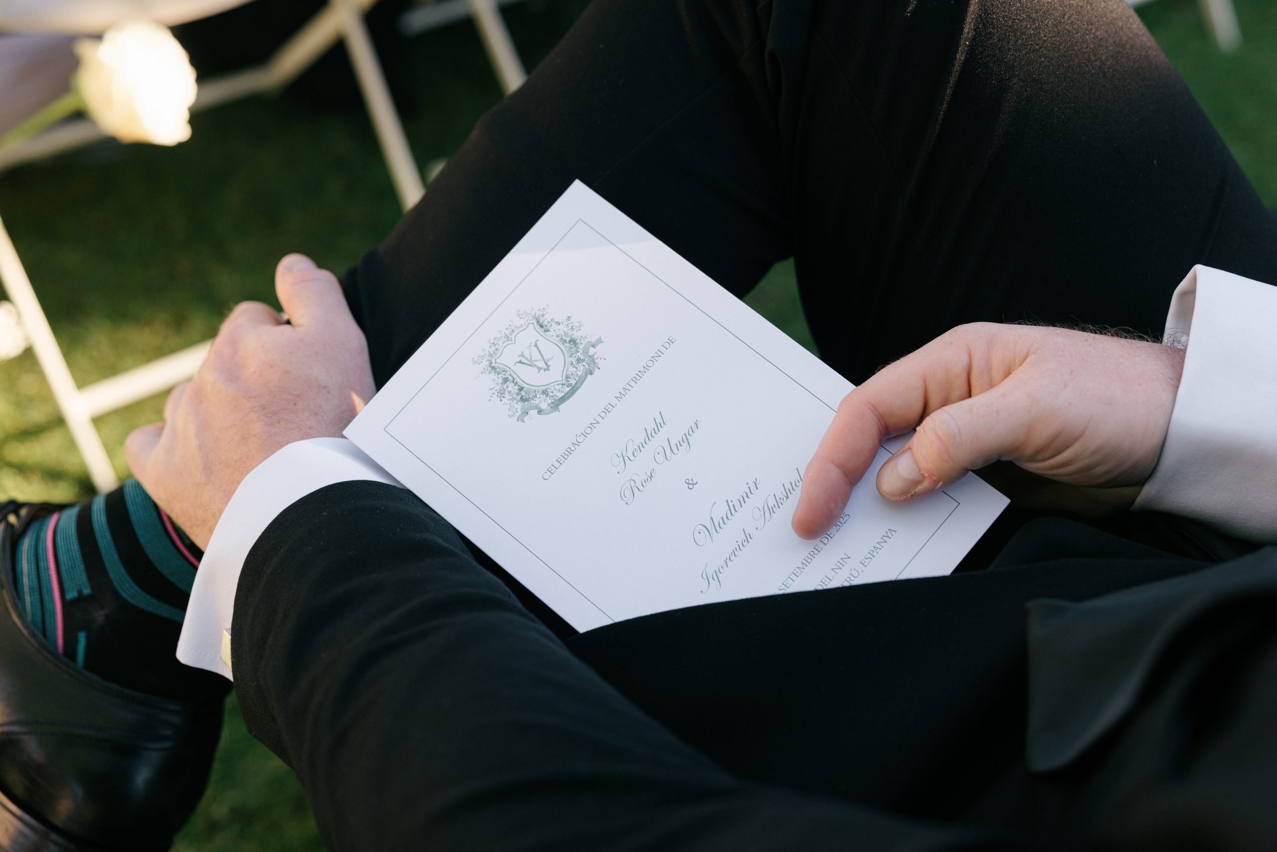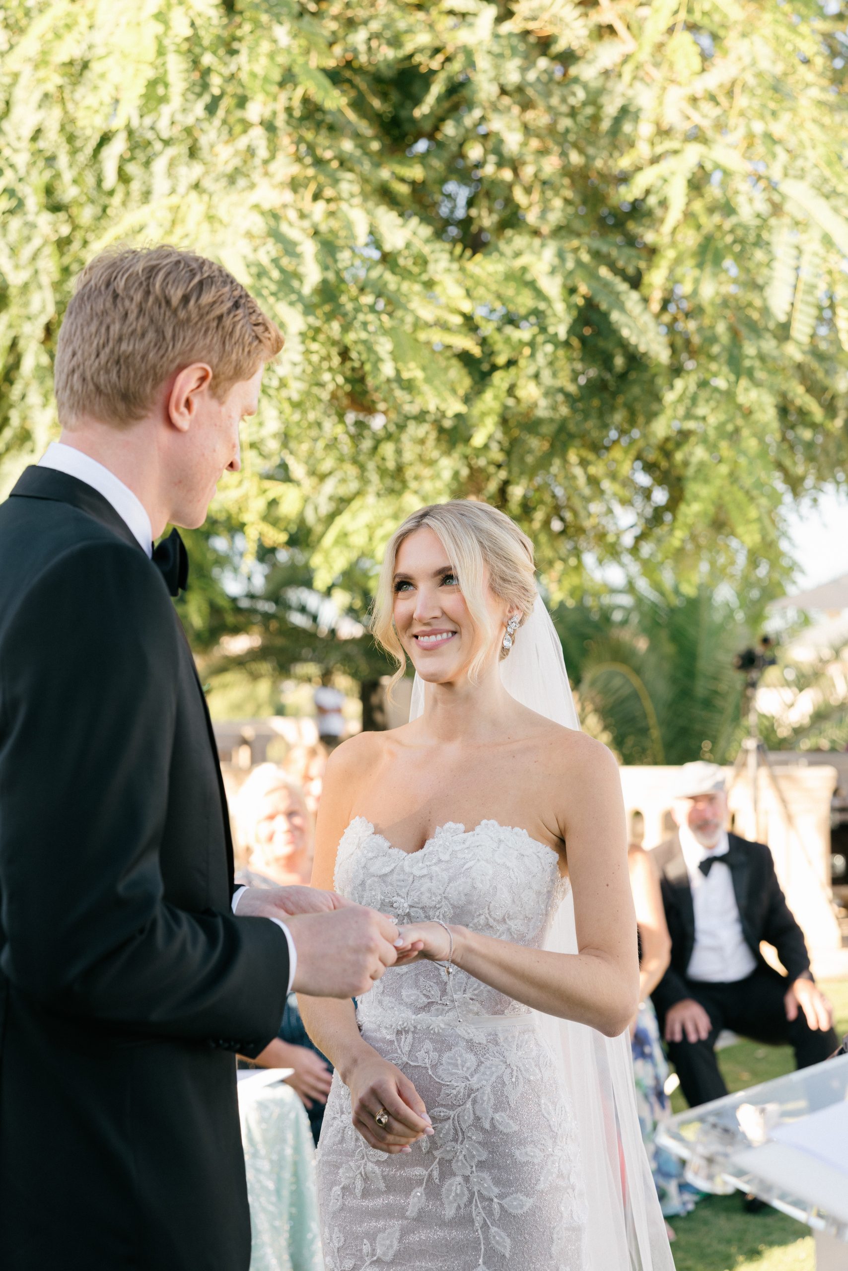 The ceremony took place in the gardens, framed by the blue horizon and the golden afternoon light. Outdoor ceremonies here have a quality that is very hard to replicate anywhere else in Catalonia, the sea, the light and the architecture all working together without any effort.