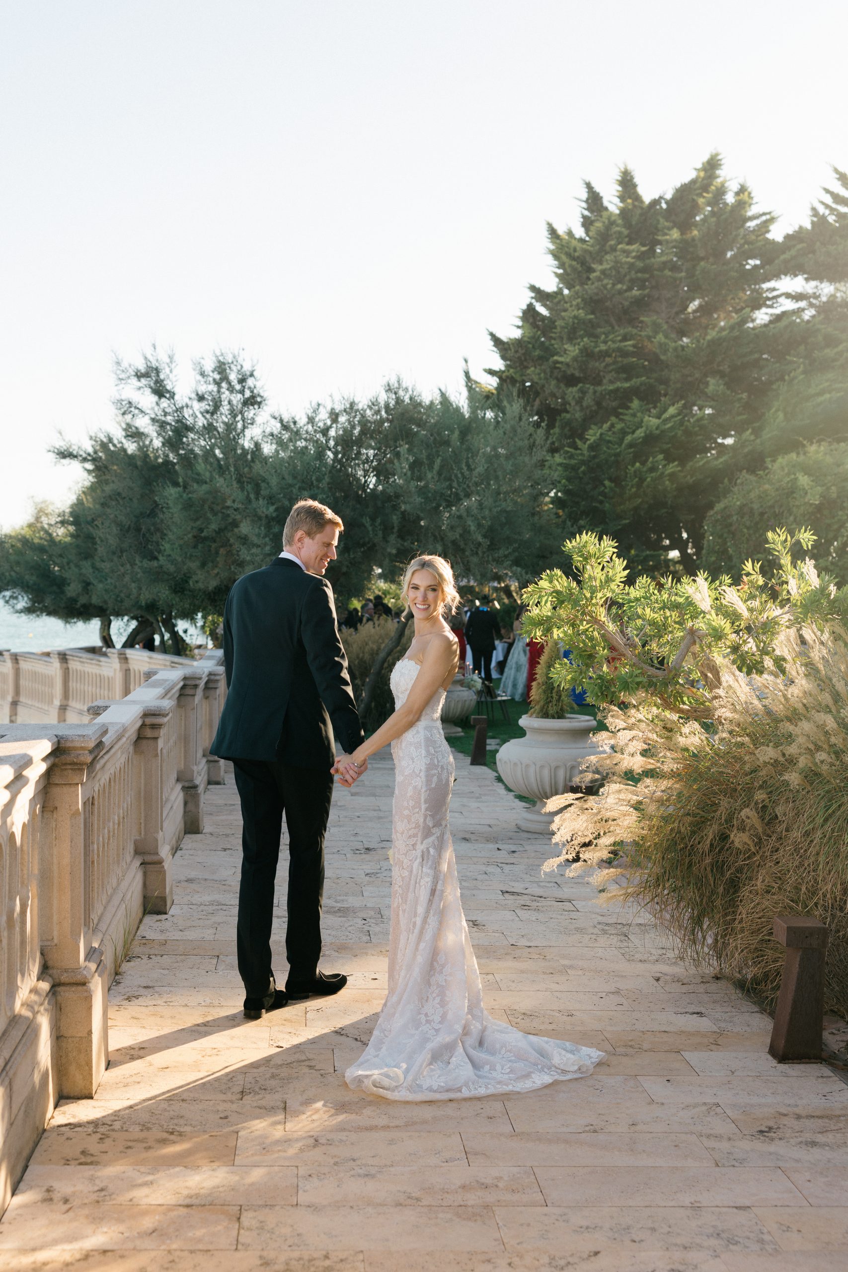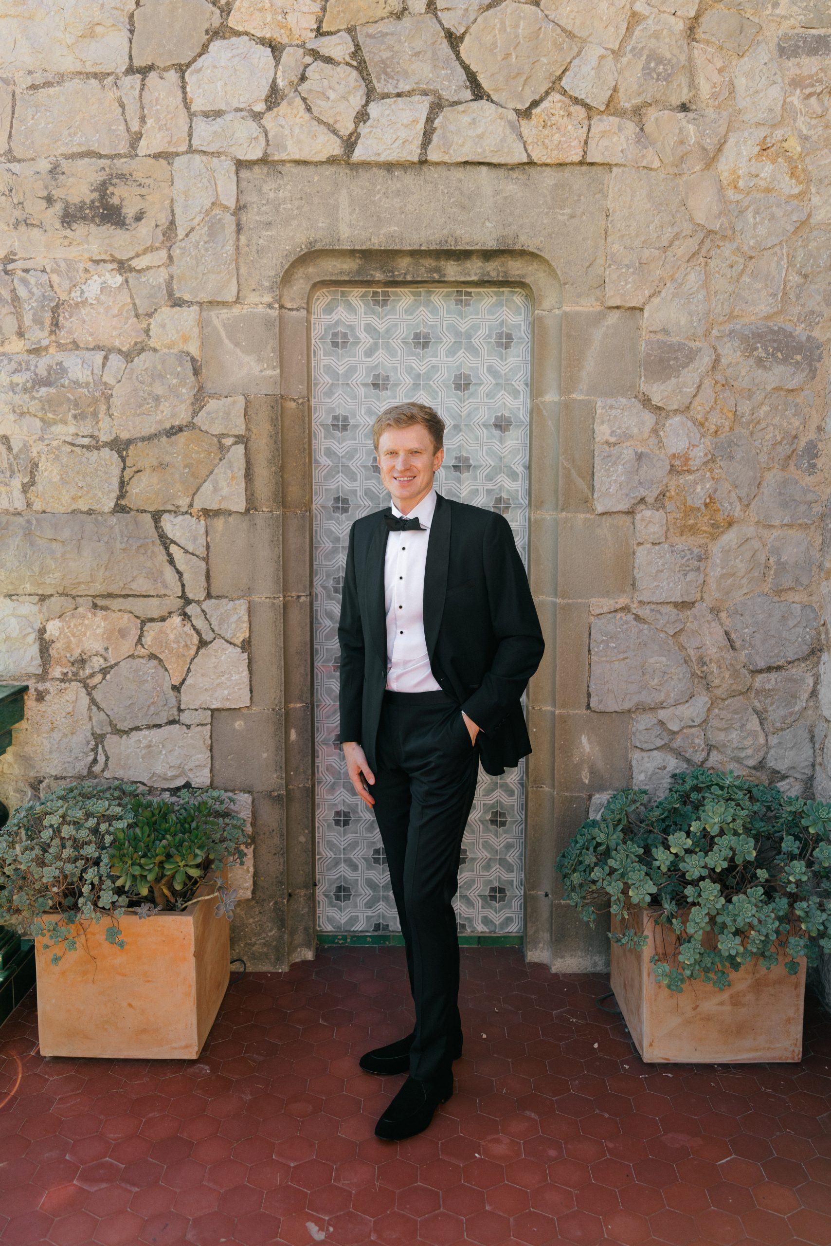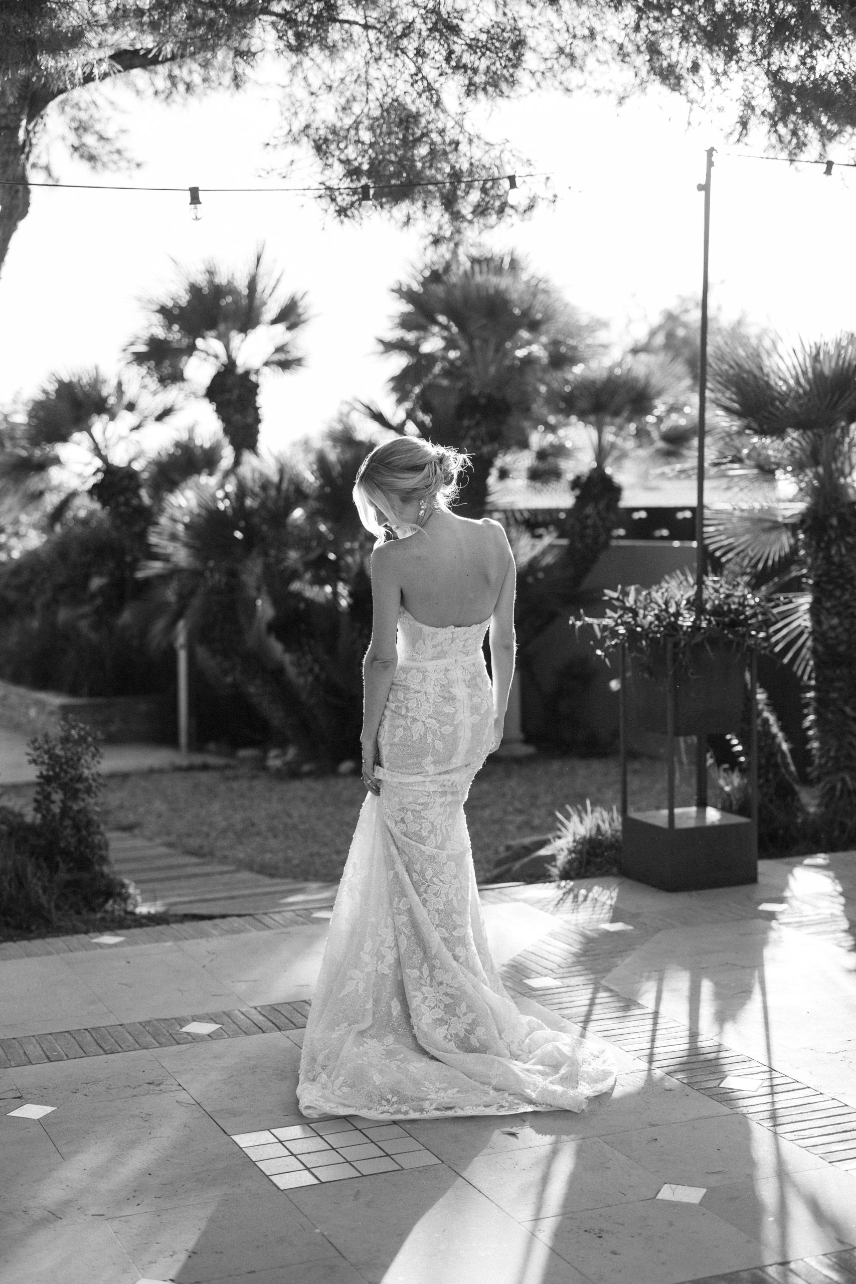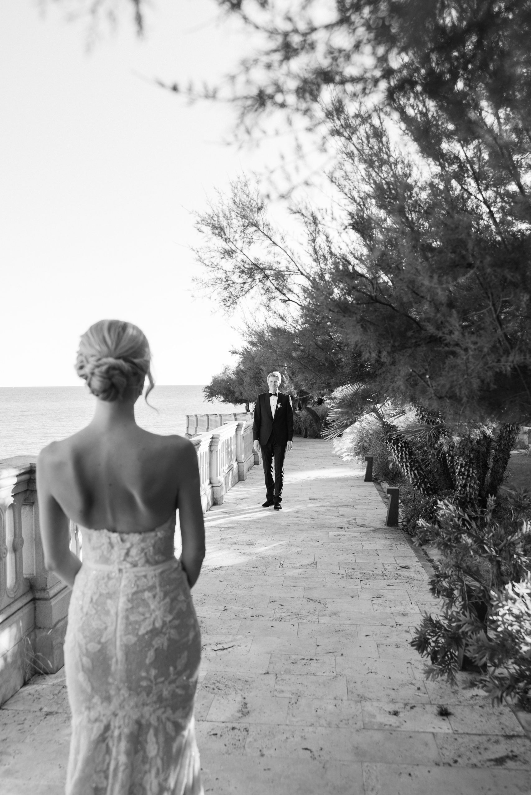 The day began with preparations inside the villa. Kendahl got ready in a light that comes through the windows and falls on the stone walls in a way that feels completely natural and completely cinematic at the same time. Vlad waited outside with the Mediterranean in the background.